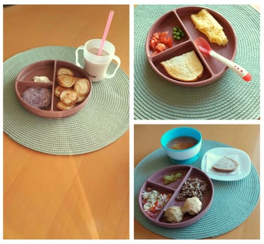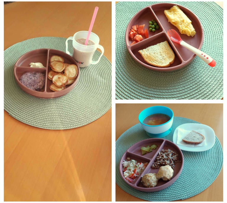 Nuotraukoje matote vienos dienos vaikučių dienos patiekalų pavyzdį.